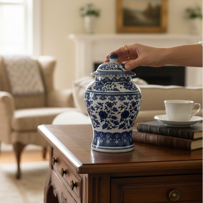 Frasco azul blanco bajo