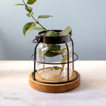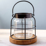 Fanal linterna porta vela de vidrio, con estructura metálica y base de madera.