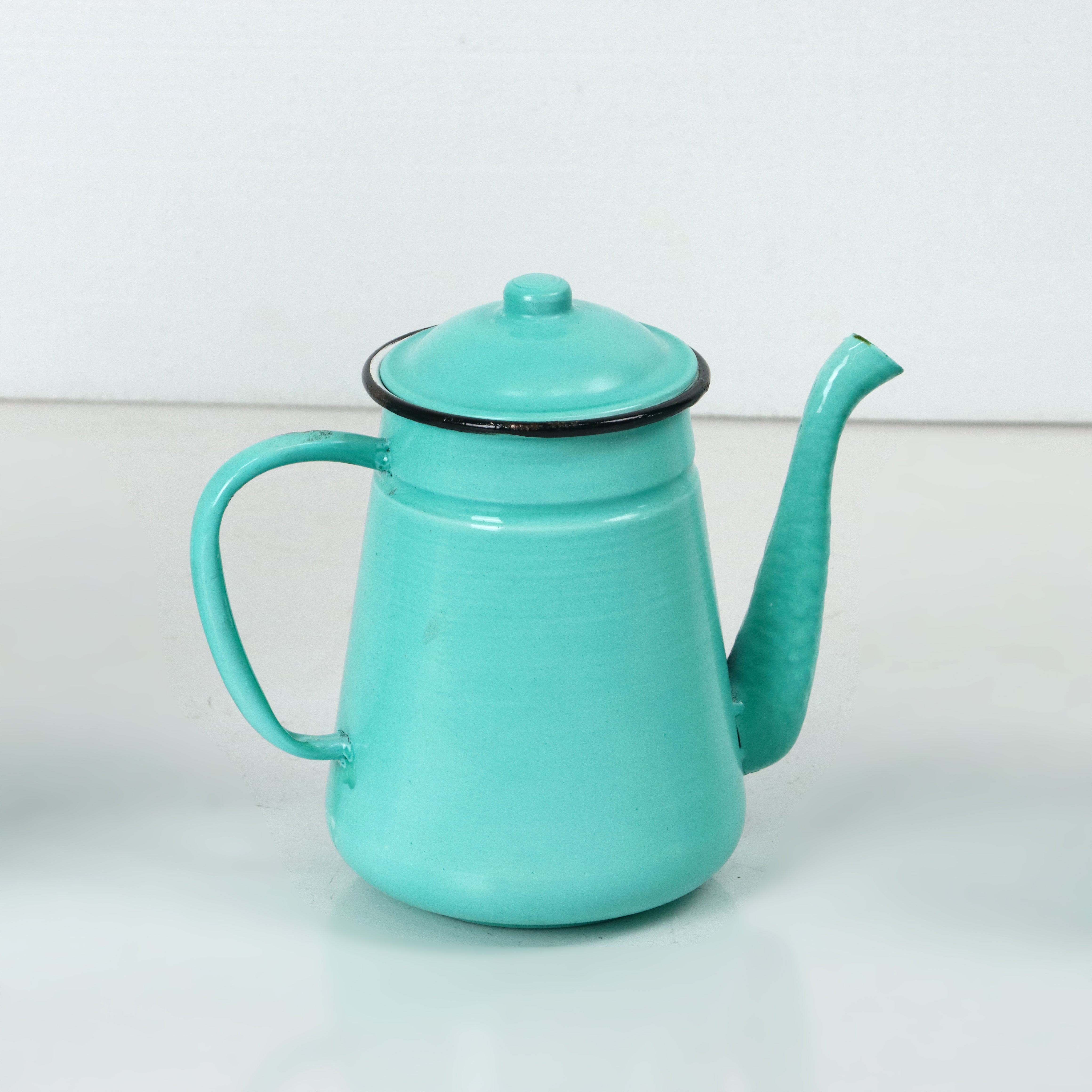 Tetera turquesa metálica enlozada envejecida.