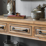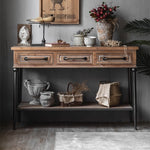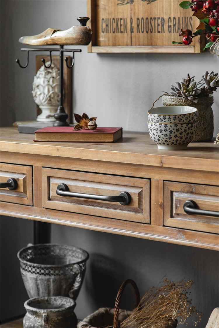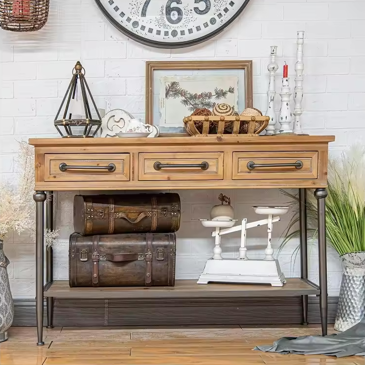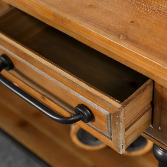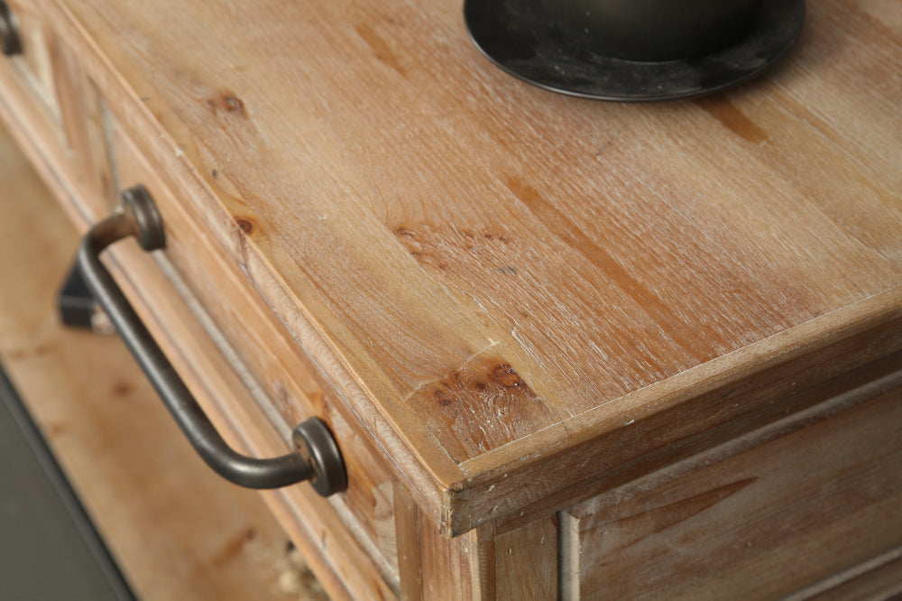 Arrimo rústico madera de abeto y patas de fierro con tres cajones. Acabado envejecido. Cajones no tienen rieles.