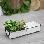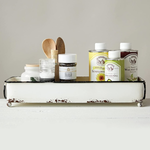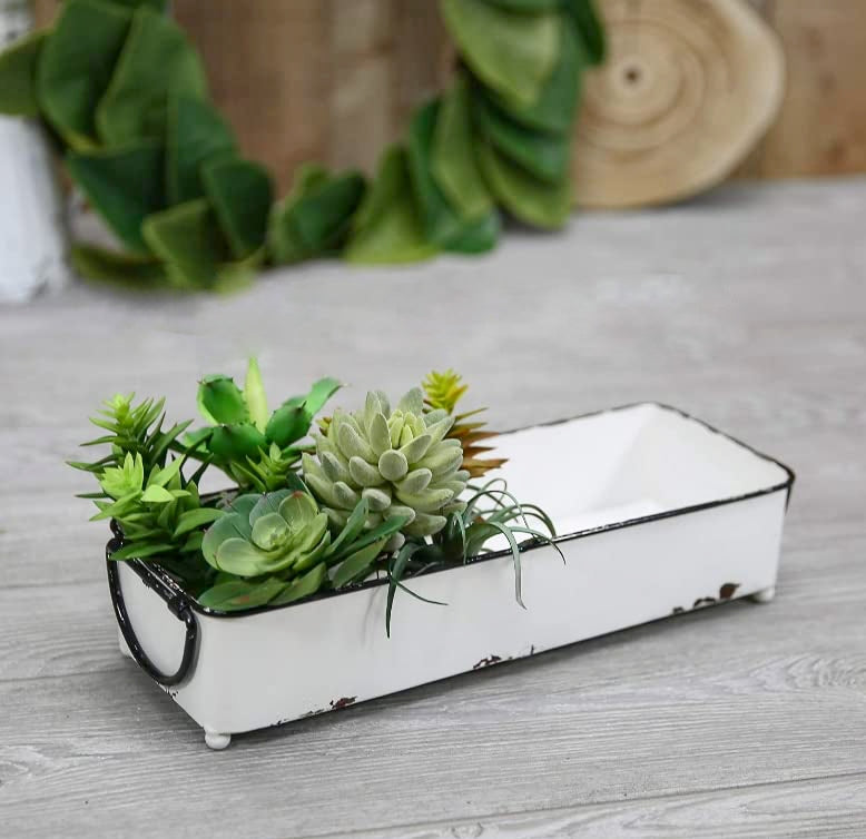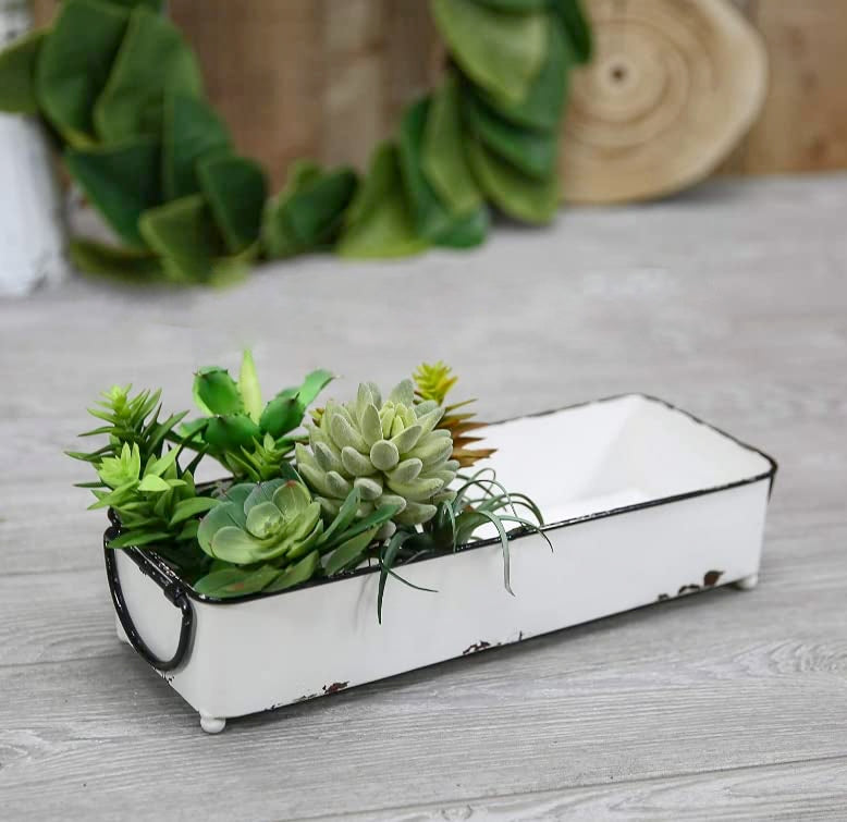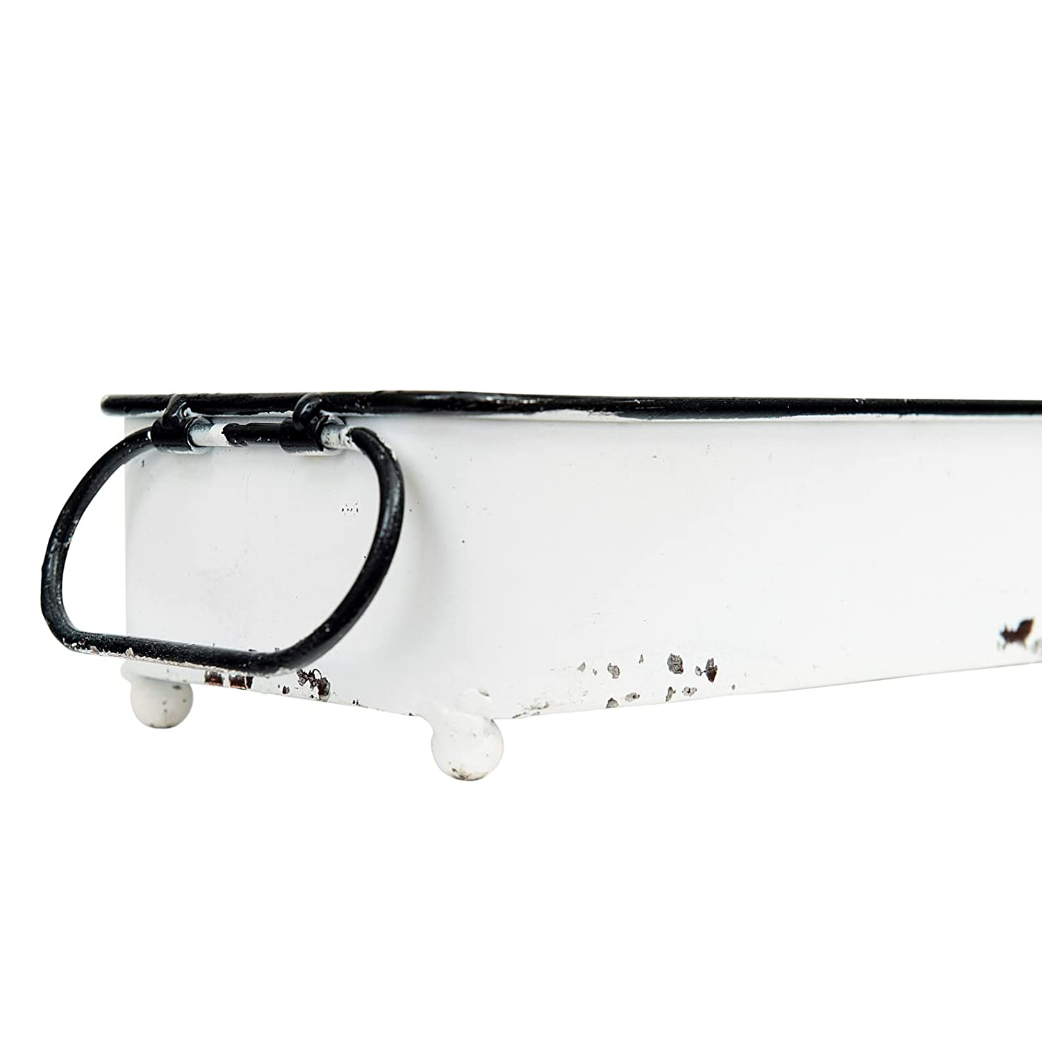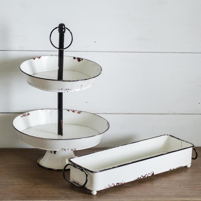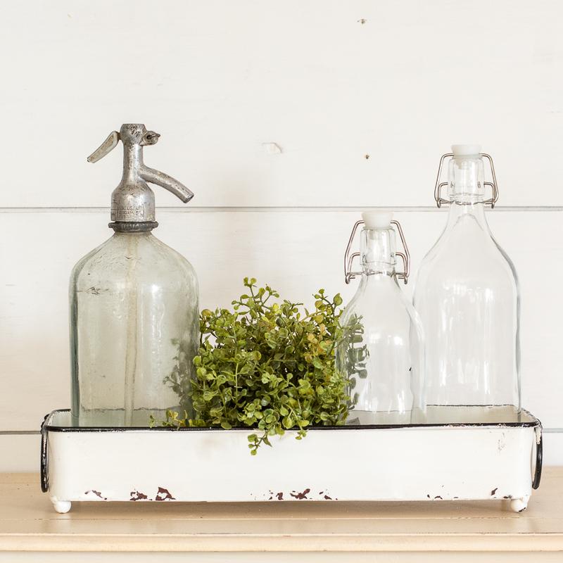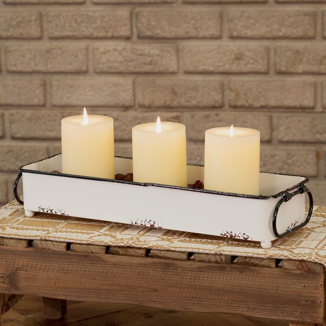 Bandeja metálica enlozada envejecida con asas metálicas negras.