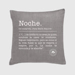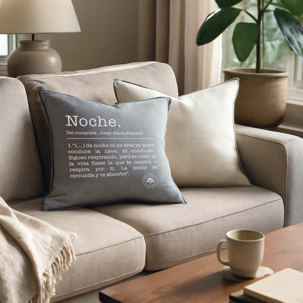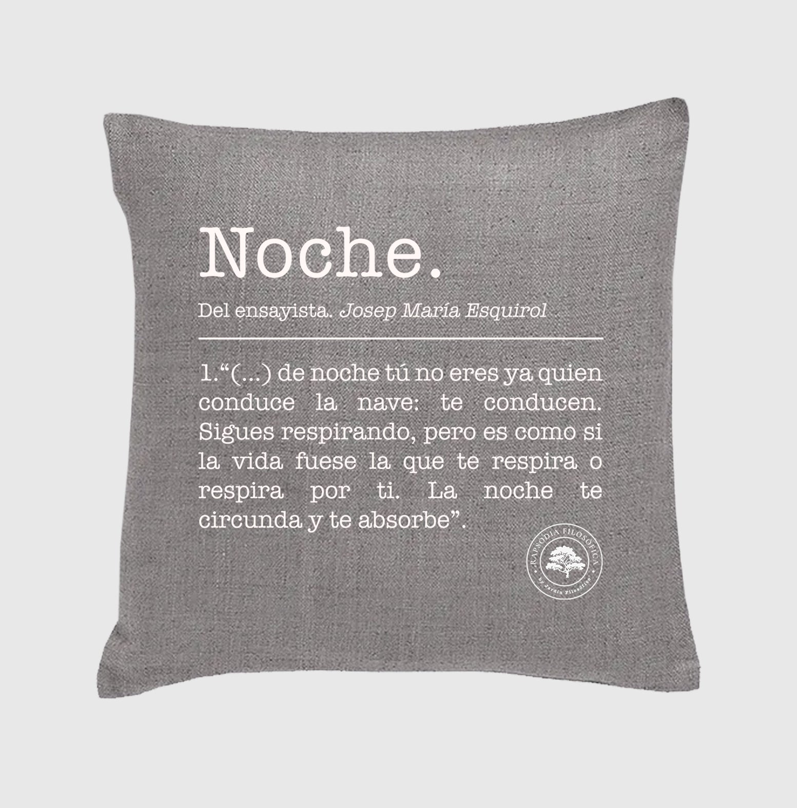 Funda de cojín estampada en serigrafía con conceptos y citas color gris.
