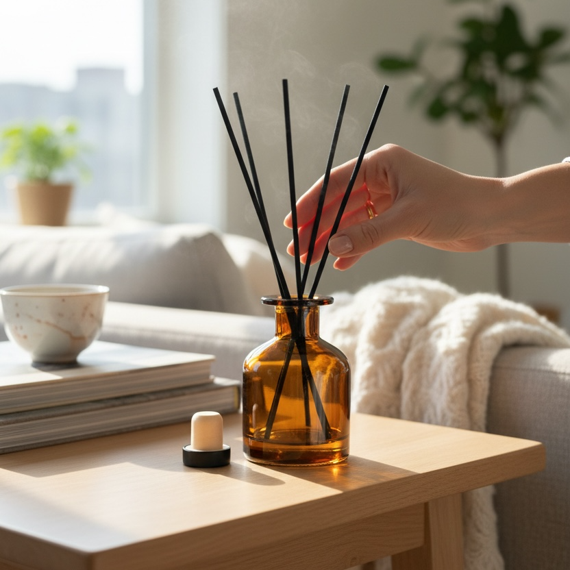 Botella dispensador / difusor de aroma / mikado ámbar de vidrio.