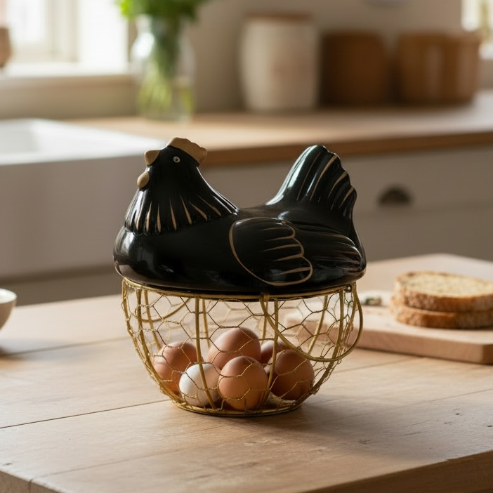 Contenedor gallina para huevos de cerámica con canasto metálico dorado.