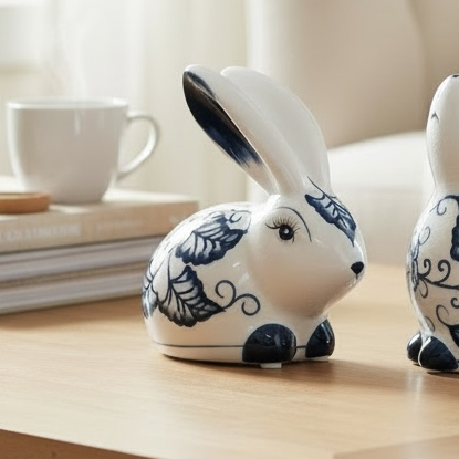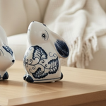 Conejo de cerámica blanco y azul.