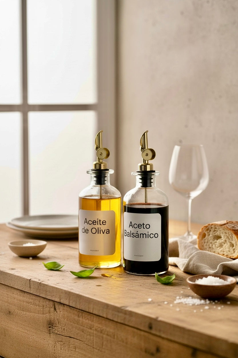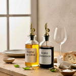 Alcuza de aceite / aceto / syrup de vidrio con dispensador metálico de acero inoxidable.
